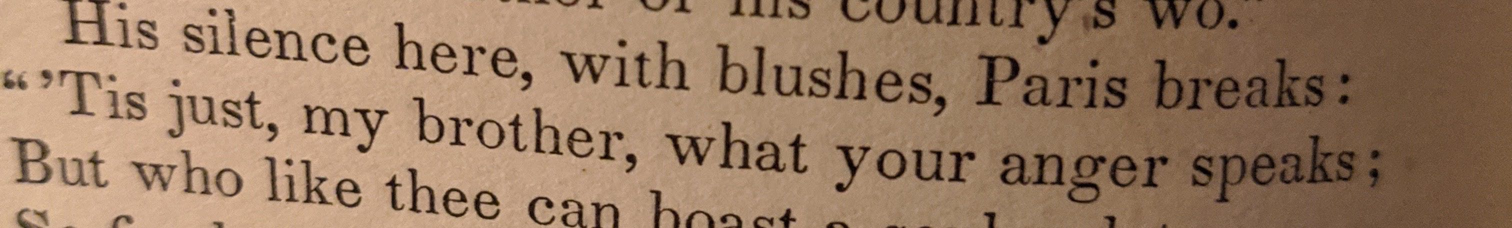 Take this one from Book 3, for example. Paris, famous lover/kidnapper of Helen, has spent the entirety of the book taking it on the chin from everyone. Neither the Greeks nor the Trojans are particularly happy with him having taken Helen away, he fights a pitiful duel with a Greek king that ends in a cowardly divine rescue, Helen is asking about her dead brothers... it's a bad scene for handsome boy Paris.